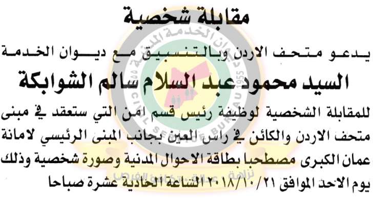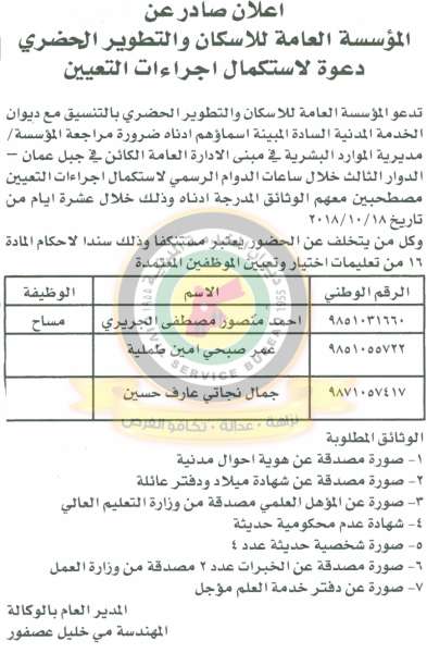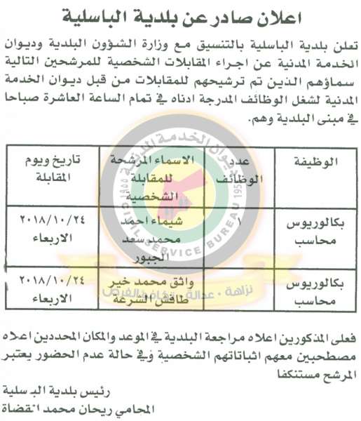 سرايا - دعا ديوان الخدمة المدنية بالتعاون مع مختلف الوزارات والمؤسسات الحكومية، التالية اسماؤهم لاجراء المقابلات الشخصية وعقد الامتحان التنافسي لغايات التعيين.