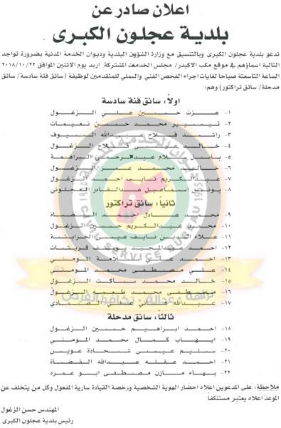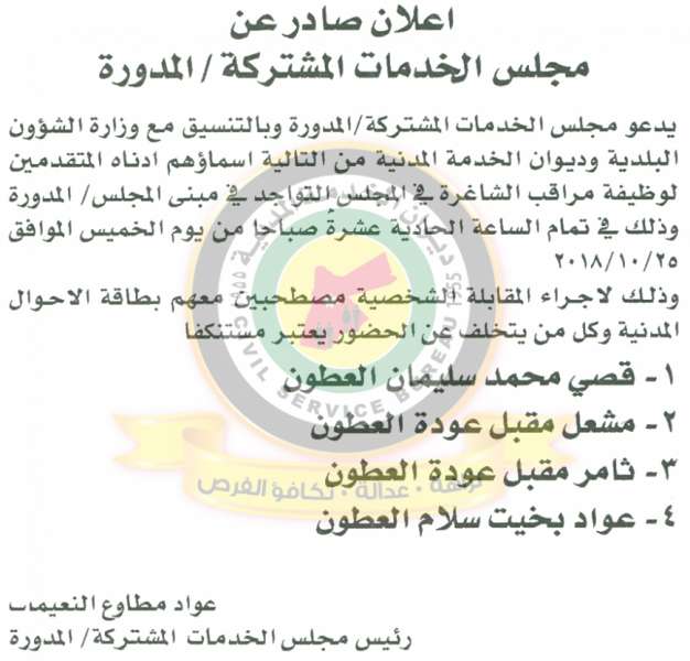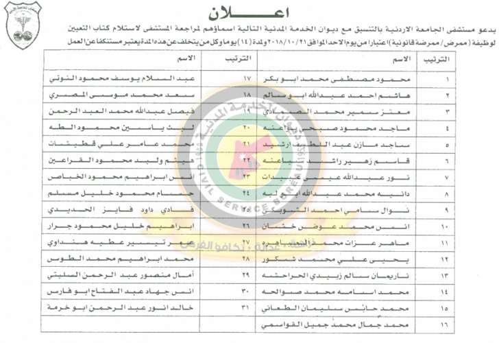 دعو ديوان الخدمة المدنية بالتنسيق مع وزارة الصحه، التالية أسماؤهم التواجد يوم الاثنين الموافق 1/10/2018، الساعة 11 صباحا في مبنى ديوان الخدمة المدنية الكائن في طبربور/ شارع الأقصى، لحضور الامتحان التنافسي الالكتروني.