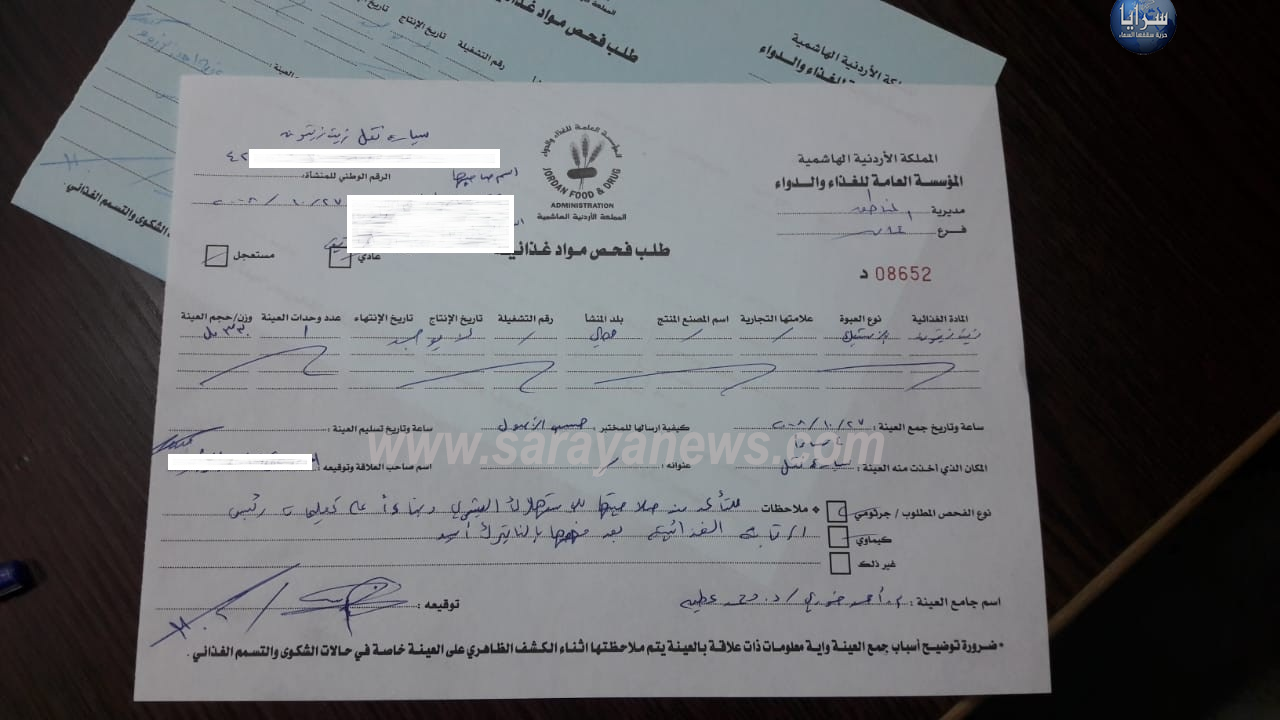 سرايا - تمكنت فرق الرقابه على الغذاء- التابعه للمؤسسة العامه للغذاء والدواء- من ضبط 66 تنكة زيت زيتون مغشوش، حيث تلقت الموسسه العامه للغذاء والدواء شكوى عبر منصة الشكاوى الالكترونيه التابعه للموسسه من احد المواطنين انه قام بشراء تنكة زيت زيتون لها طعم ورائحه غير مستساغه.
