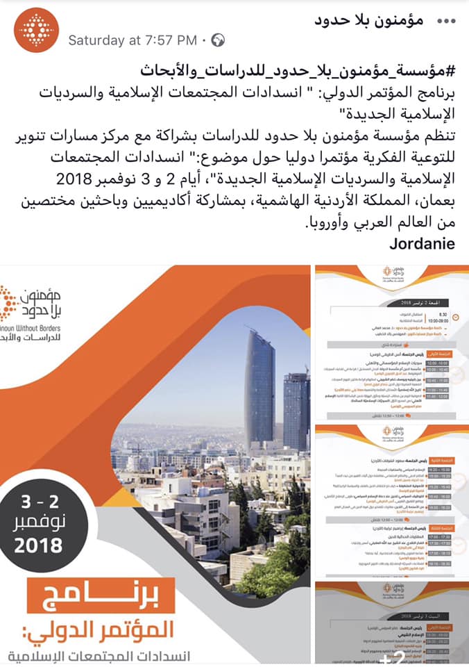 وكانت تعتزم منظمة تدعى (مؤمنون بلا حدود) عقد مؤتمر دولي لها في الاردن يومي الخميس والجمعة ٢ و ٢٠١٨/١١/٣ في احد فنادق العاصمة عمان .