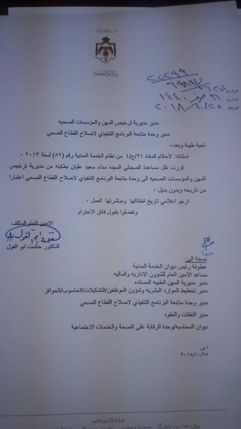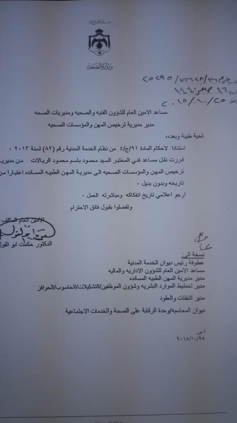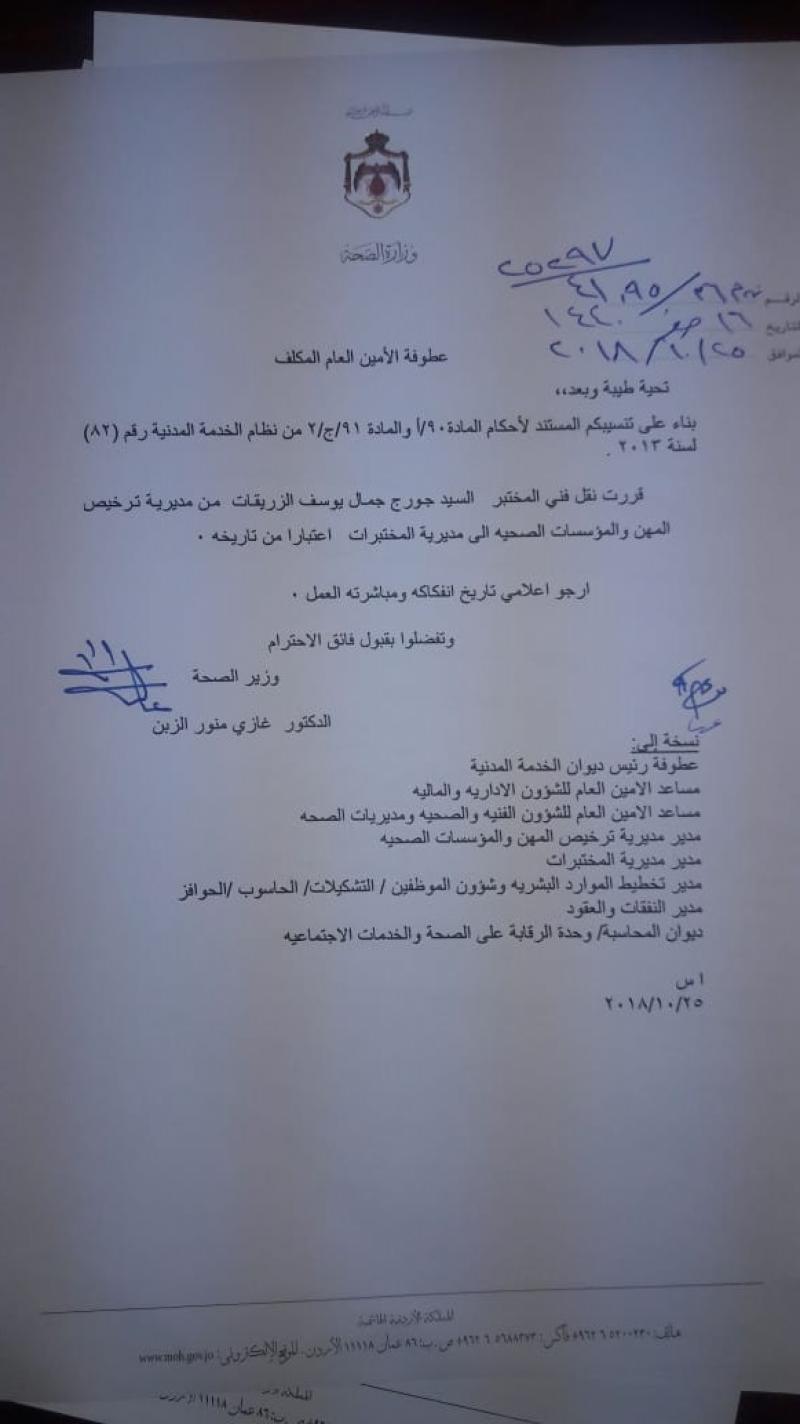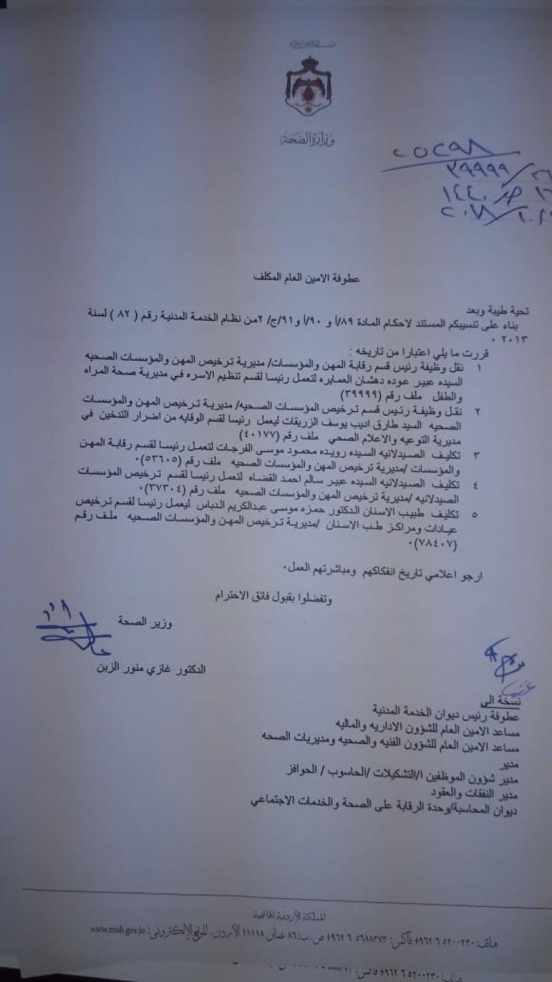 سرايا - قرر وزير الصحة الدكتور غازي الزبن، نقل غالبية موظفي مديرية ترخيص المهن والمؤسسات في الوزارة إلى مواقع مختلفة.