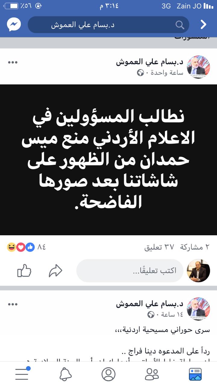 رصد - كتب الوزير السابق الدكتور بسام العموش ، عبر صفحته على "فيس بوك": "نطالب المسؤولين في الاعلام الأردني منع ميس حمدان من الظهور على شاشاتنا بعد صورها الفاضحة".