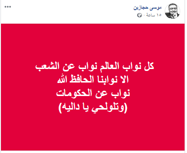 سرايا - نشر الفنان الاردني موسى حجازين تدوينة عبر حسابه فيسبوك مساء الأحد:" كل نواب العالم نواب عن الشعب .. الا نوابنا الحافظ االله.. نواب عن الحكومات".