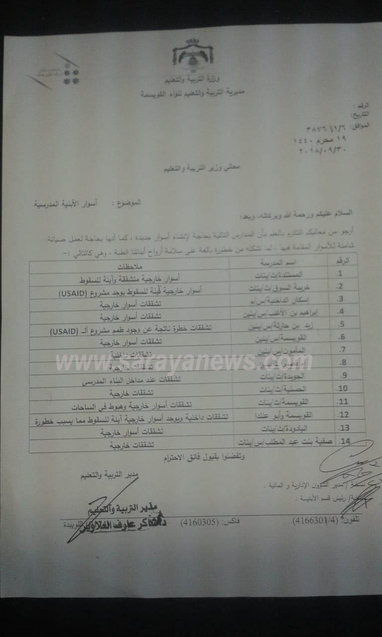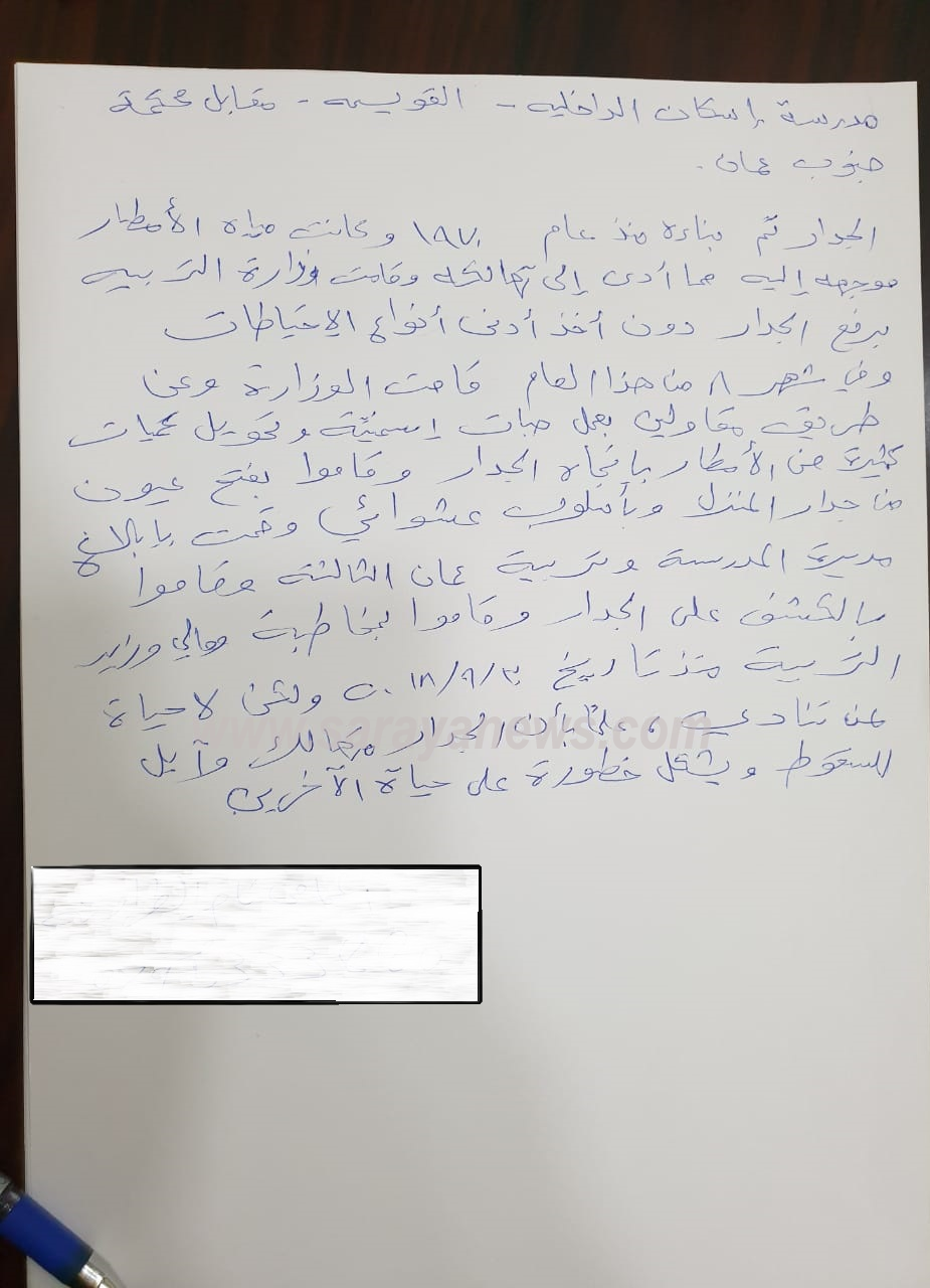 واضاف الاهالي انهم قاموا بتقديم شكوى لمديرية تربية عمان الثالثة ولكن دون جدوى مشيرين الى ان المديرية قامت بأرسال فرق هندسية للكشف عن وجود الخلل ،وكان تقرير اللجنة بأزالة السور كونه متهالك و آيل للسقوط ،والتربية لم تتحرك ساكناً منذ أكثرمن سنة.