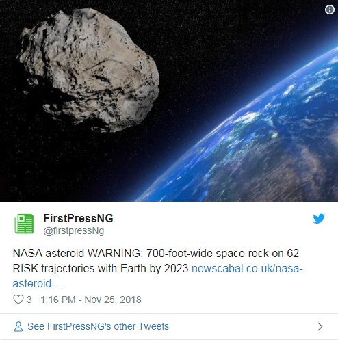 ويدعى الكويكب” الـ – اف- 16- 2018″، ولاحظ علماء مختبر الدفع النفاث التابع لناسا في 16 يونيو/ حزيران الماضي، بعد إجراء حسابات، أن الكويكب يمثل تهديداً، وأكدوا أن الكويكب قد يتصادم مع كوكبنا خلال 62 مرة من عام 2023 حتى عام 2117.