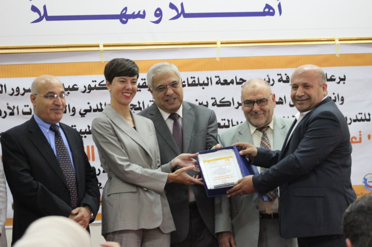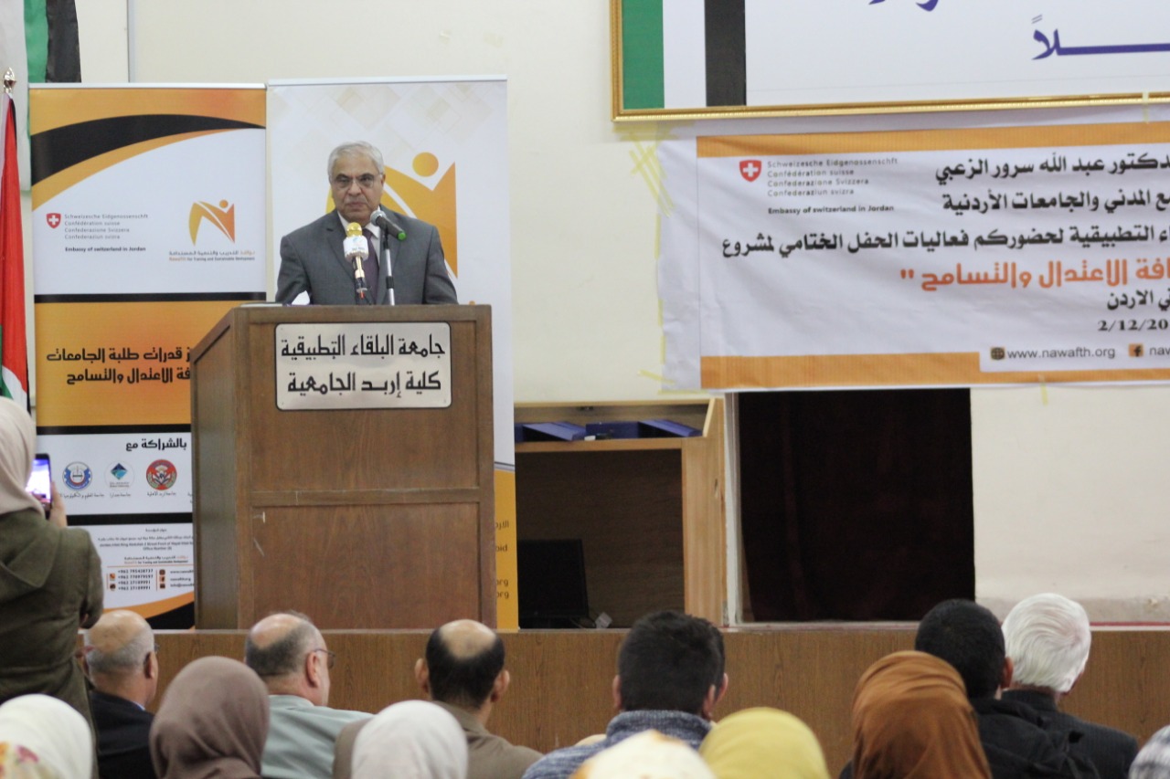 برعاية عطوفة الاستاذ الدكتور عبدالله سرور الزعبي رئيس جامعة البلقاء أطلقت مؤسسة نوافذ للتدريب والتنمية المستدامة فعاليات الحفل الختامي لمشروع تعزيز قدرات طلبة الجامعات لنشر ثقافة الاعتدال والتسامح الممول من السفارة السويسرية في الأردن والذي ينفذ بالشراكة مع جامعات وكليات محافظة اربد بهدف تفعيل دور الطلبة في الجامعات من خلال تشكيل مجموعات طلابية متمكنة وقادرة على تصميم وتنفيذ وقيادة مبادرات طلابية مجتمعية تهدف للتشجيع وتعزيز الترابط المجتمعي.