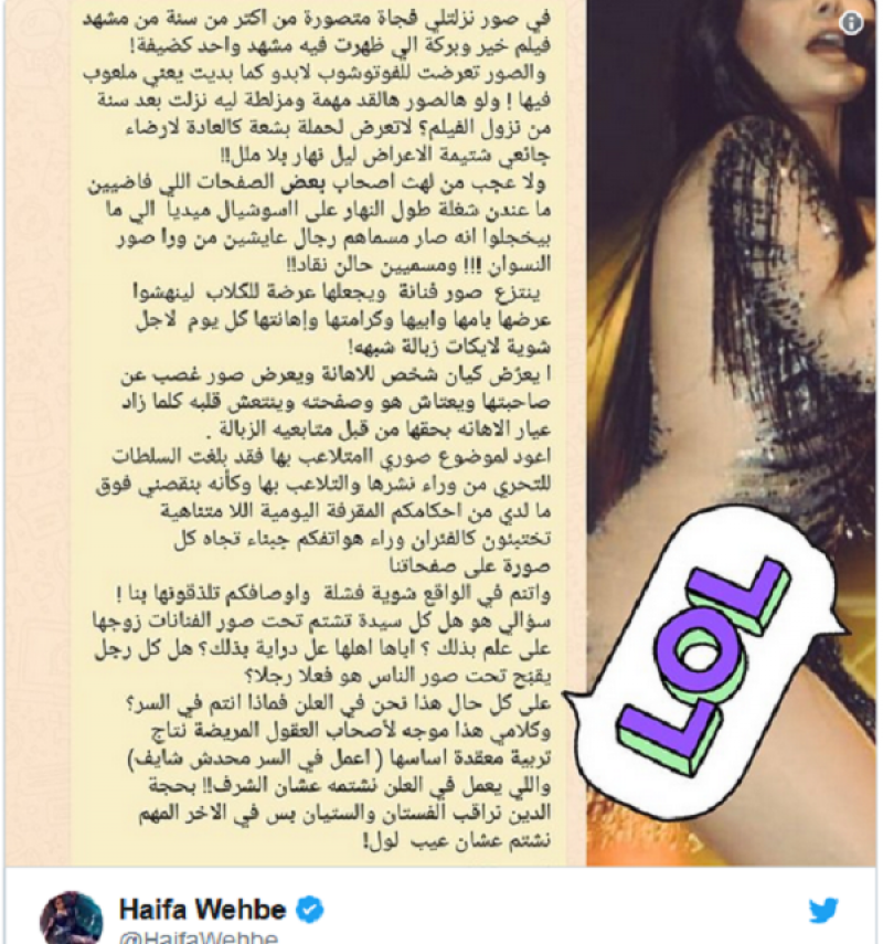 هيفاء وهبي، قالت في بيانها عبر صفحتها الشخصية بموقع «تويتر»: «في صور نزلتلي فجأة متصورة من أكتر من سنة من مشهد فيلم خير وبركة ظهرت فيه بمشهد واحد كضيفة، والصور تعرضت للفوتوشوب لأبدو كما ترون يعني ملعوب فيها، لأتعرض لحملة بشعة كالعادة لإرضاء جائعي شتيمة الأعراض ليل نهار بلا ملل».