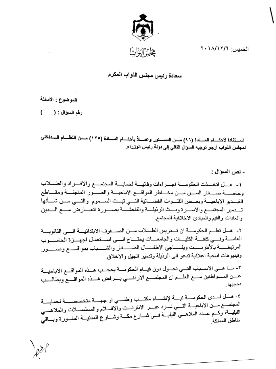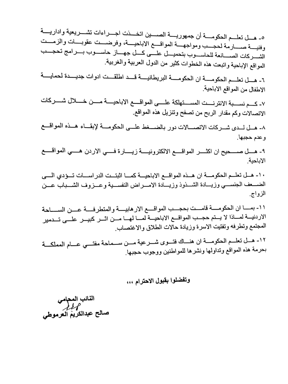 وتاليا الاسئلة التي وجهها العرموطي للرزاز والتي تتعلق بالمواقع الاباحية وخطرها على الاطفال و الشباب :