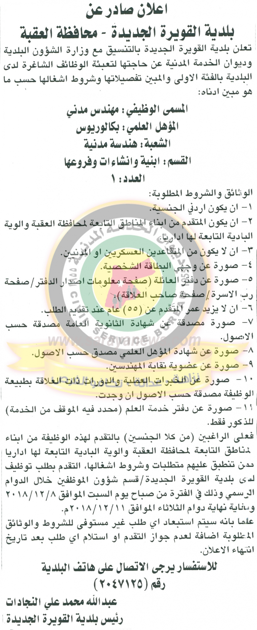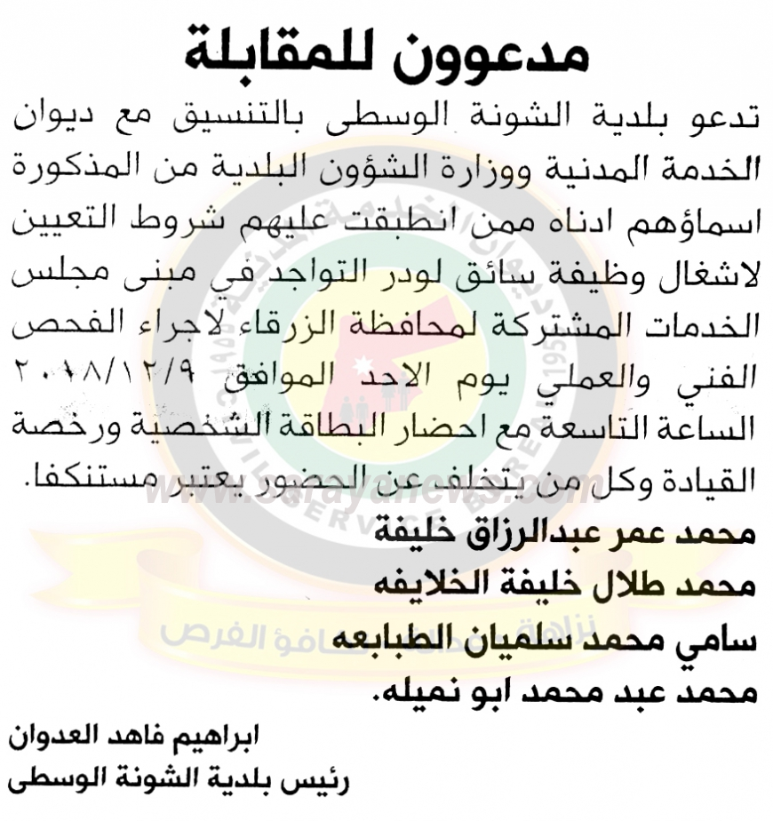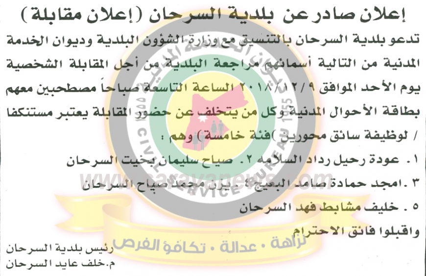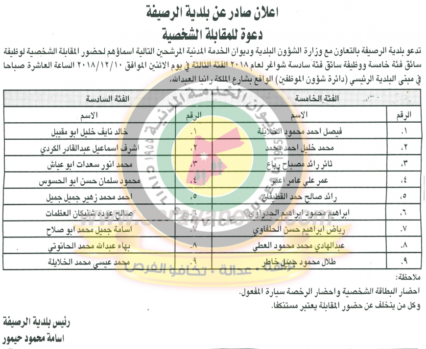 سرايا - دعا ديوان الخدمة المدنية بالتعاون مع مختلف البلديات والمؤسسات الحكومية، التالية اسماؤهم لاجراء المقابلات الشخصية وعقد الامتحان التنافسي لغايات التعيين، و استنادا للشروط المنصوص عليها من كل مؤسسة.