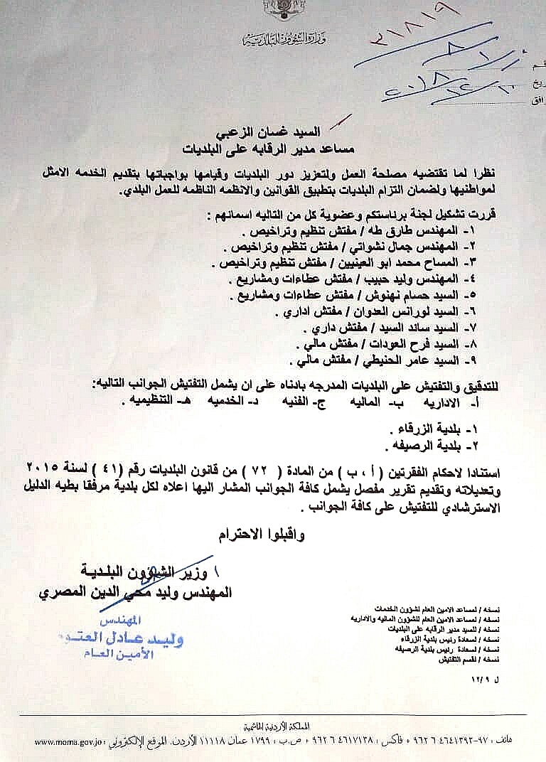 وكان وزير الشؤون البلدية وزير النقل المهندس وليد المصري بعث كتابا لبلدية الزرقاء والرصيفة لتشكيل لجنة للتدقيق والتفتيش على ان يشمل التفتيش على الجوانب الادارية والمالية والفنية والتنظيمية والخدمية .