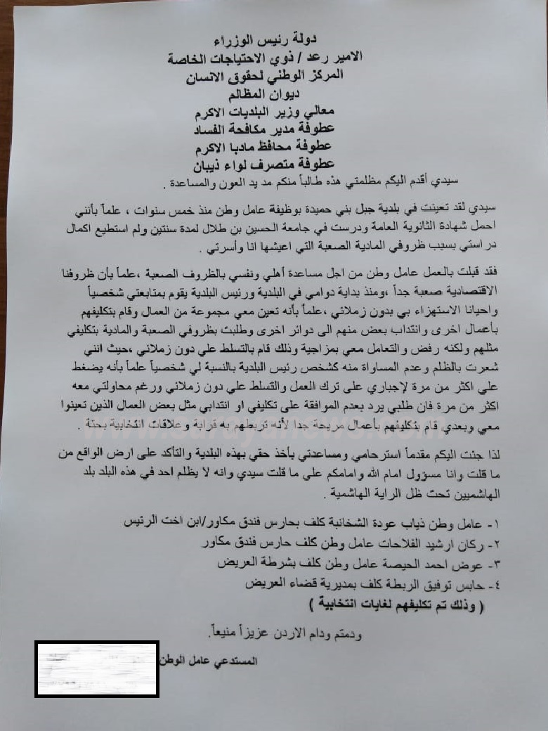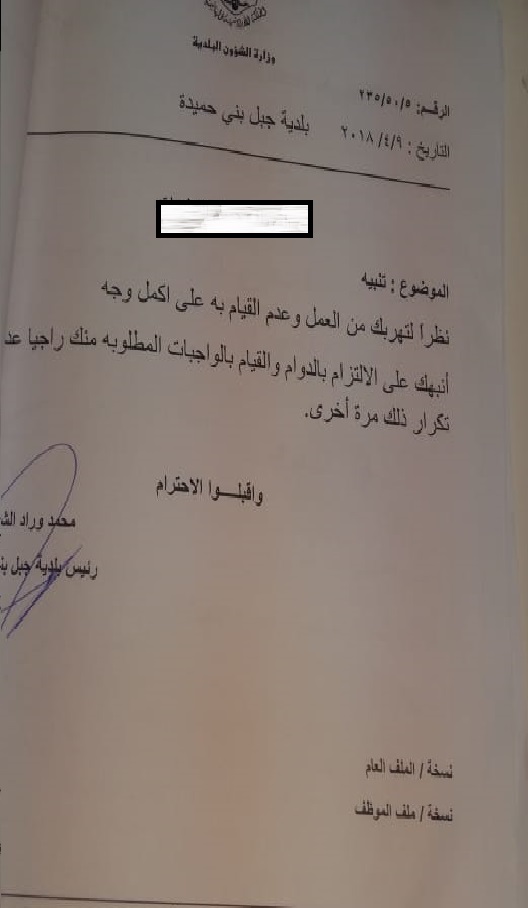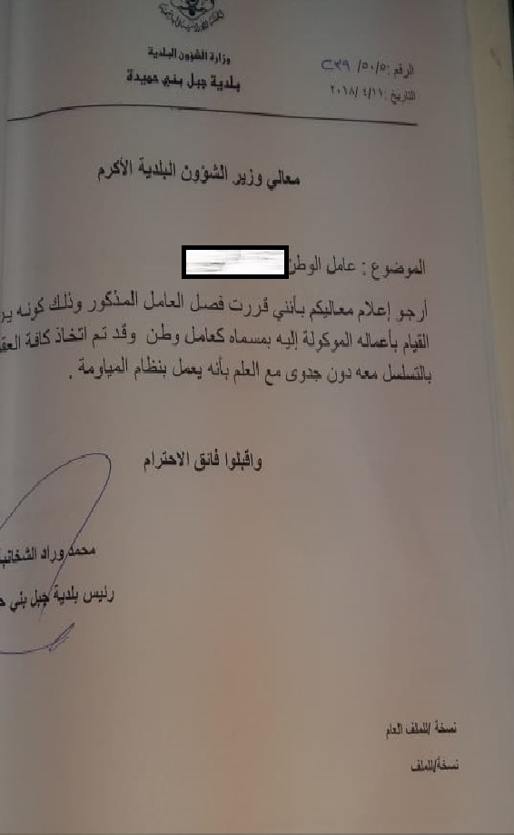 موسى العجارمة - أشتكى عامل وطن بسبب فصله التعسفي من بلدية بني حميدة ما تسبب له بخسائر مادية ومعنوية كبيرة كونه معيل لأسرته.