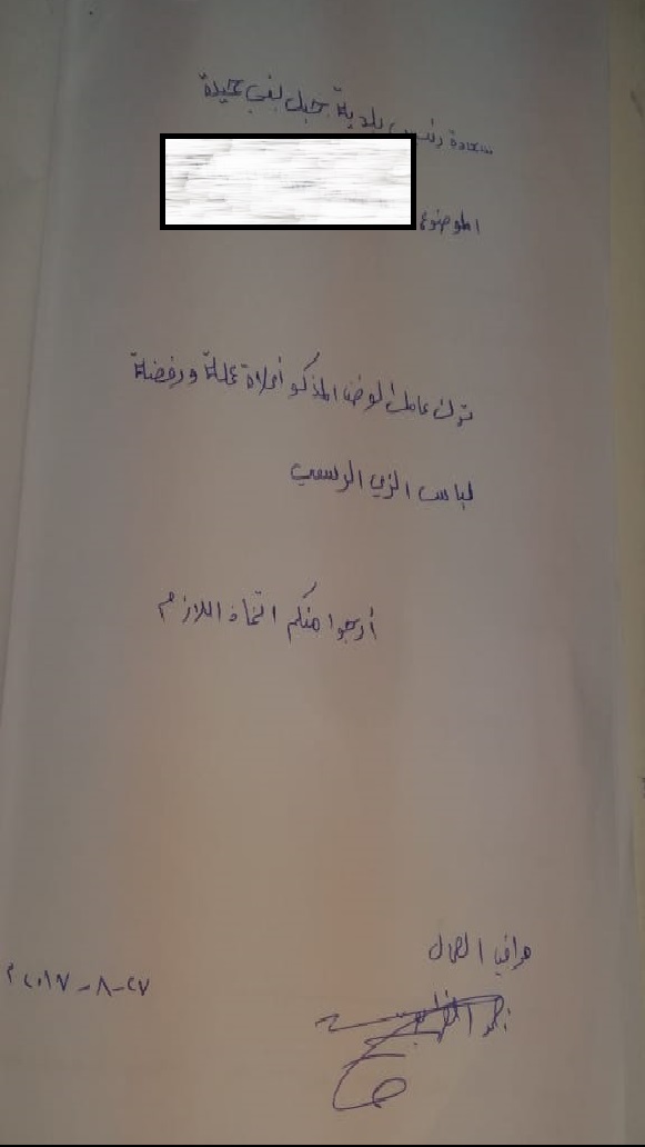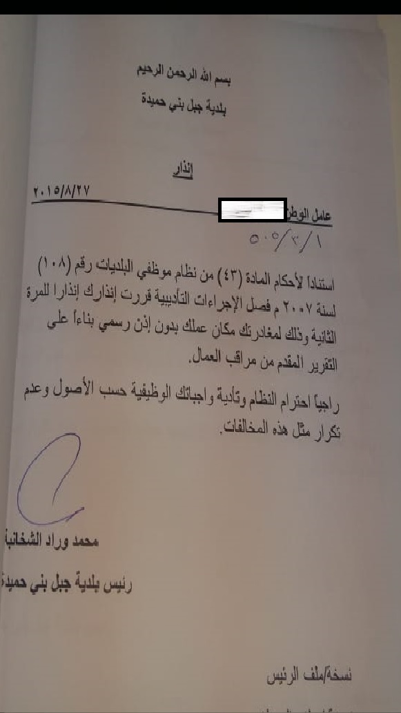 ولفت عامل الوطن انه بعدما رفض طلب رئيس البلدية بالاستقالة عن العمل أصبح يتصيد له بالماء العكر ويقوم باصدار مخالفات وهمية كيدية بحقه وبالاضافة الى الأستهزاء والتجريح المتكرر له امام الجميع .