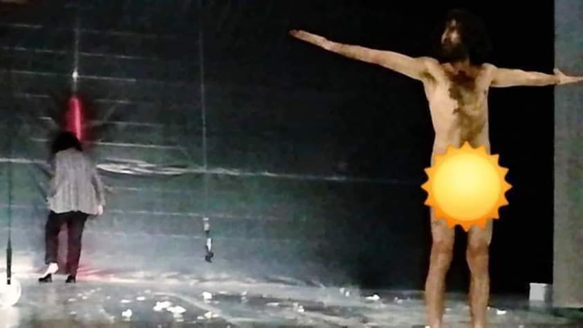 وبقي الممثّل عاريا لمدة زمنية قاربت 20 دقيقة، مما جعل عددا من الجمهور يغادرون القاعة.