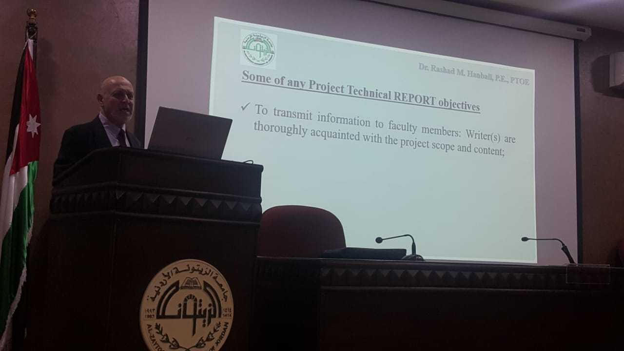 نظمت كلية الهندسة والتكنولوجيا في جامعة الزيتونة الأردنية ورشة عمل بعنوان "جودة التقرير النهائي لمشروع التخرج و متطلباته" نفذها الدكتور رشاد حنبلي بحضورعدد من طلاب واعضاء هيئة التدريس في الكلية .
