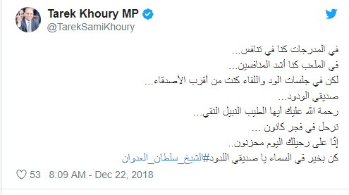وكتب خوري عبر حسابه في موقع التواصل الاجتماعي تويتر: في المدرجات كنا في تنافس... في الملعب كنا أشد المنافسين... لكن في جلسات الود واللقاء كنت من أقرب الأصدقاء... صديقي الودود... رحمة الله عليك أيها الطيب النبيل النقي... ترحل في فجر كانون ... إنّا على رحيلك اليوم محزنون.. كن بخير في السماء يا صديقي اللدود".
