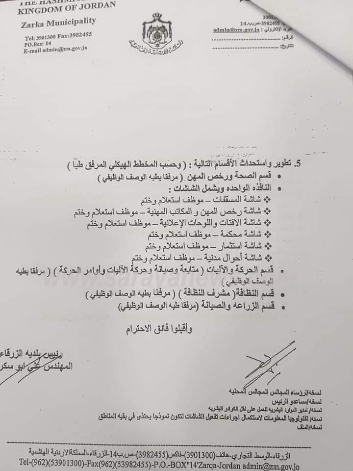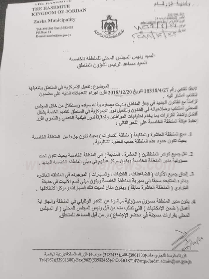 قرر رئيس بلدية الزرقاء المهندس علي ابو السكر دمج 3 مناطق في البلدية واعادة هيكلة المنطقة الخامسة لتفعيل اللامركزية في مناطق البلدية ضمن اطار تقديم الخدمات المتميزة وتسهيل الاجراءات على المواطنين .