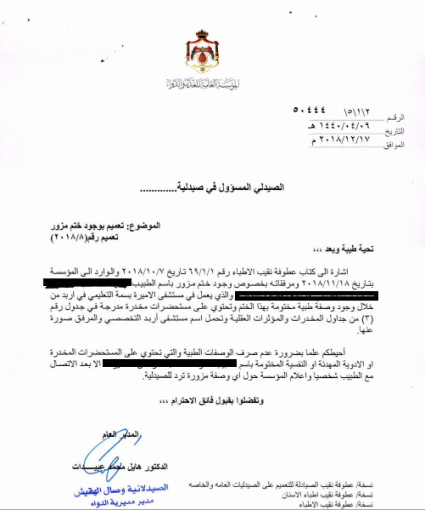 سرايا - كشفت المؤسسة العامة للغذاء والدواء عبر تعميم صادر منها عن ختم طبي مزور لأحد الأطباء الأردنيين في مدينة اربد، قام من خلال مجهول بصرف وصفة طبية تتضمن "مستحضرات مخدرة".