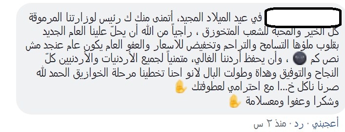 وعلق آخر : في عيد الميلاد المجيد، أتمنى منك ك رئيس لوزارتنا المرموقة كلّ الخير والمحبة للشعب المتخوزق ، راجياً من الله أن يحلّ علينا العام الجديد بقلوب ملؤها التسامح والتراحم وتخفيض للاسعار والعفو العام يكون عام عنجد مش نص كم ، وأن يحفظ أردننا الغالي، متمنياً لجميع الأردنيات والأردنيين كلّ النجاح والتوفيق وهداة وطولت البال لانو احنا تخطينا مرحلة الخوازيق الحمد لله صرنا ناكل (....) مع احترامي لعطوفتك".