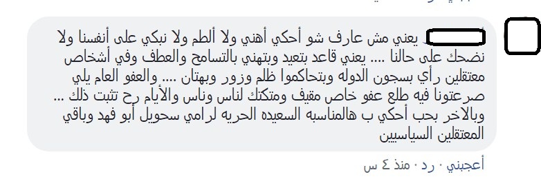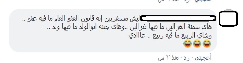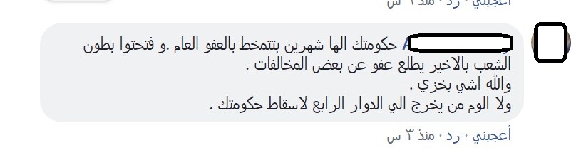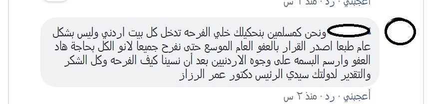 وقال احد المعلقين : "ونحن كمسلمين بنحكيلك خلي الفرحه تدخل كل بيت اردني وليس بشكل عام طبعا اصدر القرار بالعفو العام الموسع حتى نفرح جميعا لانو الكل بحاجة هاد العفو وارسم البسمه على وجوه الاردنيين بعد أن نسينا كيف الفرحه وكل الشكر والتقدير لدولتك سيدي الرئيس دكتور عمر الرزاز".