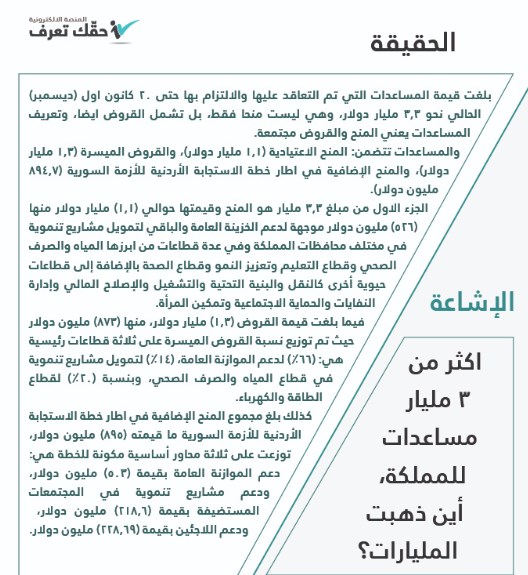 سرايا - بينت الحكومة عبر منصة "حقك تعرف " أين توزعت المساعدات التي حصلت عليها المملكة وبلغت 3.3 مليار دولار في عام 2018 .