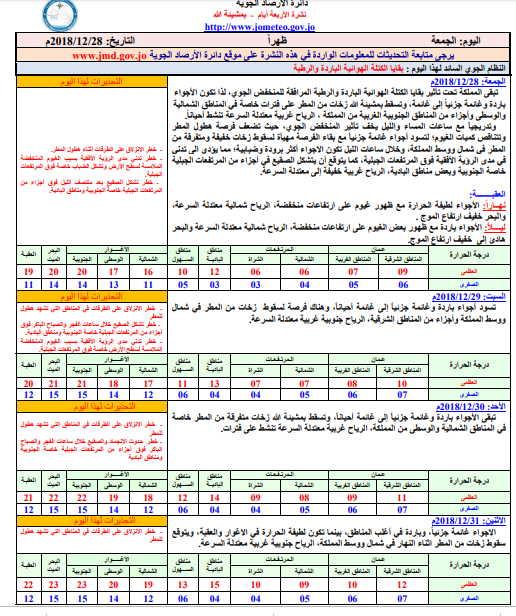 وتكون الاجواء، الاثنين، غائمة جزئياً، وباردة في أغلب المناطق، بينما تكون لطيفة الحرارة في الاغوار والعقبة، ويتوقع سقوط زخات من المطر اثناء النهار في شمال ووسط المملكة، الرياح جنوبية غربية معتدلة السرعة.