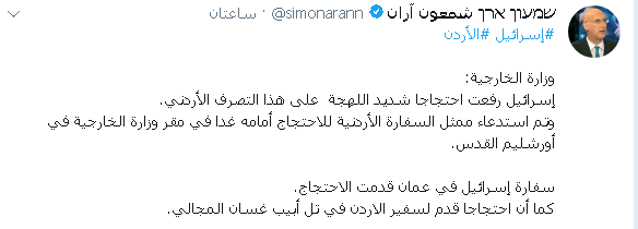 وبحسب ما نشرته الصحيفة فإن سفارة الاحتلال في عمان قدمت الاحتجاج لوزارة الخارجية، وسيتم استدعاء السفير الأردني في تل أبيب يوم غد الأحد للمثول بوزارة الخارجية في تل أبيب، لتسليمه احتجاجا رسميا. رؤيا
