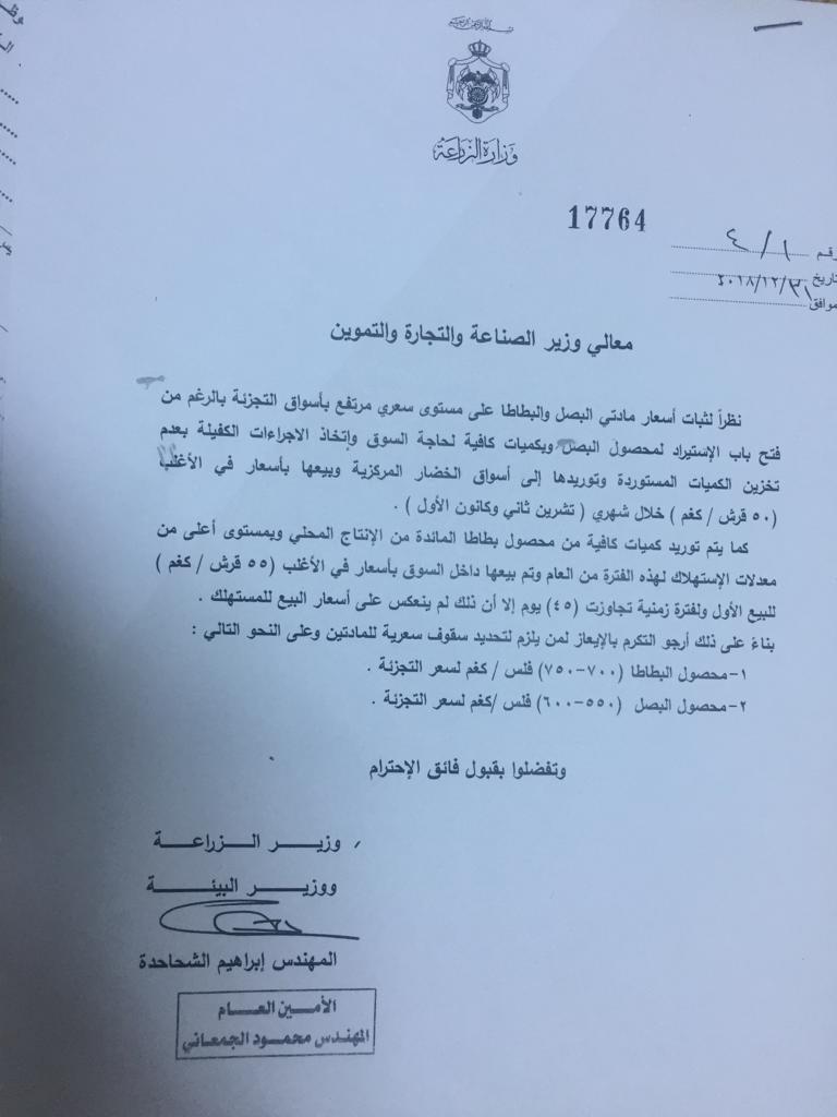 قرر وزير الزراعة ووزير البيئه م. ابراهيم الشحاحدة من خلال كتاب موجه لوزير الصناعة والتجارة بتحديد السقوف السعرية لمادتي البصل والبطاطا كالتالي :