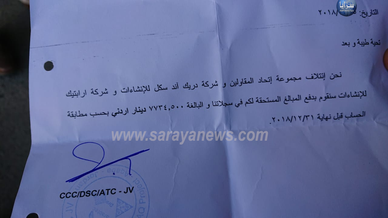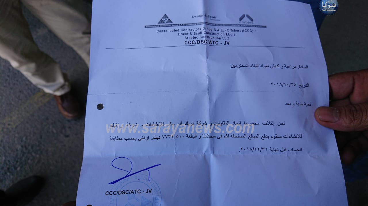 ومنذ صباح الإثنين احتشد تجار أمام مبنى ائتلاف مقاولي مشروع سرايا بالعقبه مطالبين بتسديد فواتيرهم التي تعثر صرفها لدى مقاول المشروع الذي منح عدة وعود ووجه كتب بالتعهد بالتسديد قبل 30/12/2018 إلا إن وعودهم باءت بالفشل، وعبر التجار عن تخوفهم من جرهم بخسائر فادحة وتهديد التجارة بالعقبة، وإنهم لم يجدوا مسؤول لدى المشروع يقابلونه على إثر وعود بالتسديد اليوم حسب كتب وقعها المشروع.