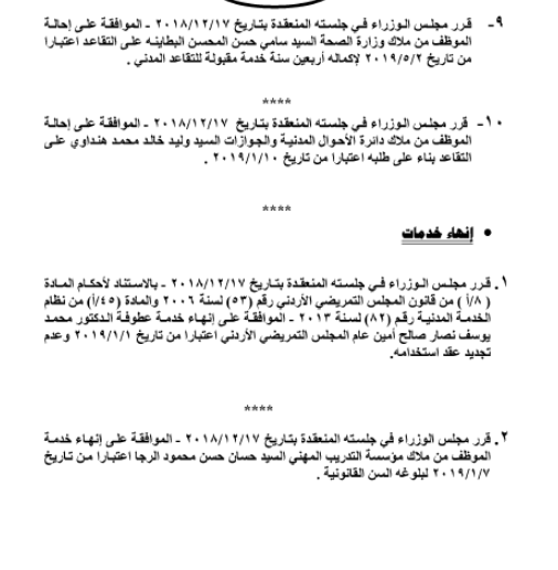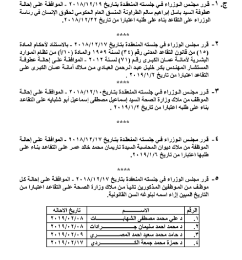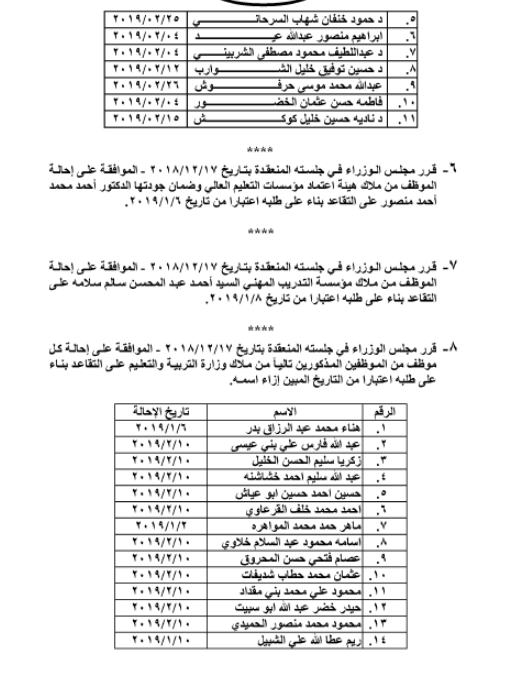 وافق مجلس الوزراء على إحالة موظفين في وزارة التربية ومختلف الوزارات والمؤسسات الحكومية على التقاعد، اعتبارا من التاريخ المبين إزاء اسم كلّ منهم.