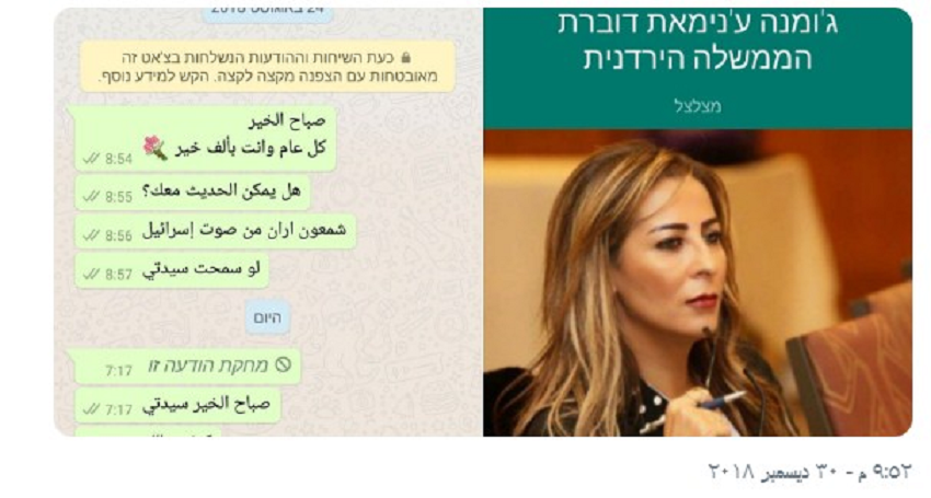 وتجاهلت وزير الدولة لشؤون الإعلام والناطق الرسمي باسم الحكومة جمانة غنيمات، الصحفي الإسرائيلي شمعون آران، بعدما راسلها عبر تطبيق "واتس آب".