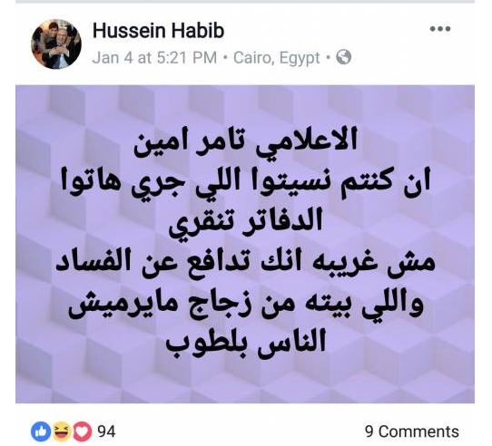وكتب حسين حبيب من خلال حسابه الخاص على "فيسبوك": "الاعلامي الكبير تامر امين ياريت تكون اسم على مسمي... اصل الاعلام مش وراثة".