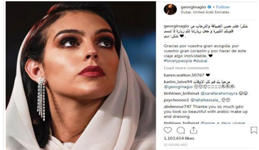 سرايا - خطفت عارضة الأزياء جورجينا رودريجز، خطيبة نجم الكرة العالمية كريستيانو رونالدو، الأنظار في إجازتها الأخيرة بدبي، بعد ظهورها بالأزياء التقليدية الإماراتية وتوجيهها رسالة باللغة العربية.
