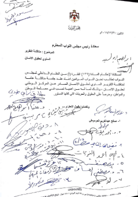 وطالب النواب الموقعون على المذكرة النيابية عقد جلسة لمناقشة التقرير السنوي لحقوق الانسان الصادر عن المركز الوطني لحقوق الانسان حرصاً على حقوق الحريات التي كلفها الدستور لما لها من أهمية تصب في مصلحة الوطن .