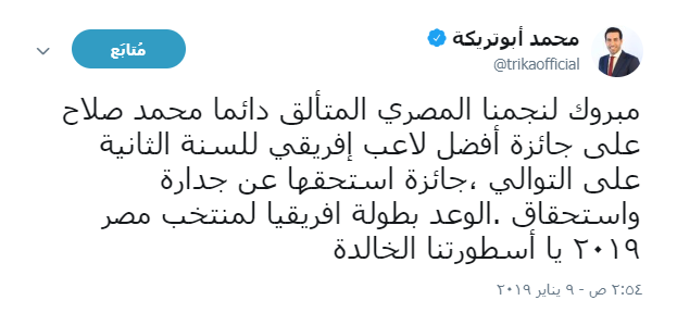 وكتب أبوتريكة عبر حسابه على موقع التواصل الإجتماعي "تويتر" "مبروك لنجمنا المصري المتألق دائما محمد صلاح على جائزة أفضل لاعب إفريقي للسنة الثانية على التوالي".