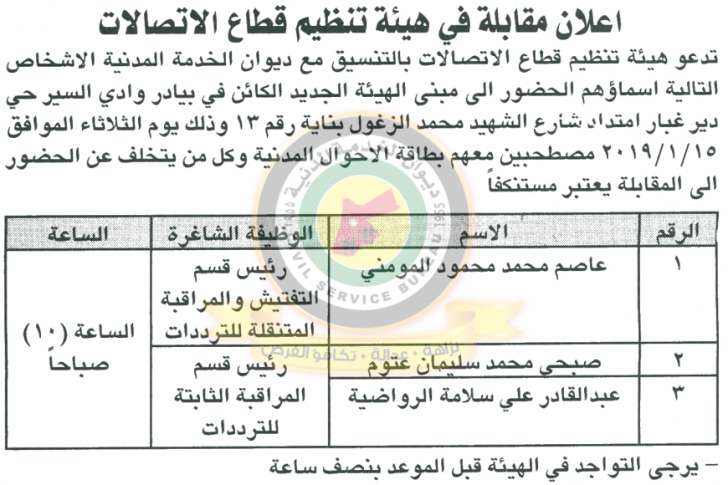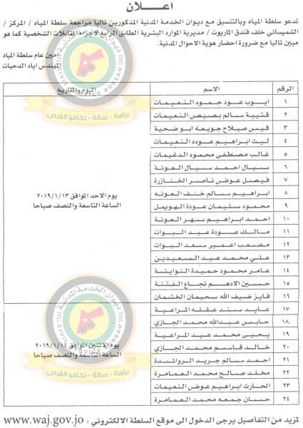 سرايا - دعا ديوان الخدمة المدنية بالتعاون مع مختلف الوزارات والمؤسسات الحكومية، التالية اسماؤهم لاجراء المقابلات الشخصية وعقد الامتحان التنافسي لغايات التعيين.