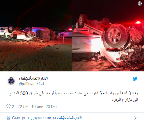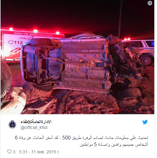من جانبها، أكدت الإدارة العامة للإطفاء في الكويت أن الحادث وقع على طريق 500 السريع قرب مزارع الوفرة، وأسفر عن مقتل 6 وافدين وإصابة 5 كويتيين، ونشرت عدة صور من الموقع.