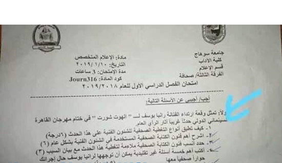 ويظهر في ورقة الأسئلة التي تم تداولها على مواقع التواصل الاجتماعي، فقرة تتحدث عن الفستان الذي أثار الرأي العام، تضمنت عددًا من النقاط، من بينها أنسَب فنون الكتابة الصحفية لتغطية هذا الحدث، مع بيان السبب، وكتابة 5 أسئلة غير تقليدية يمكن أن توجه لرانيا يوسف حال إجراء حوار صحفي معها.