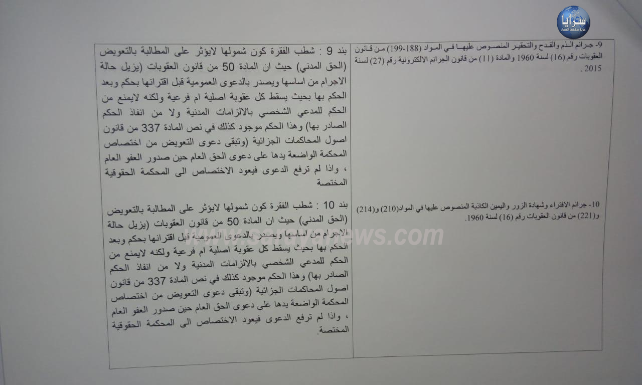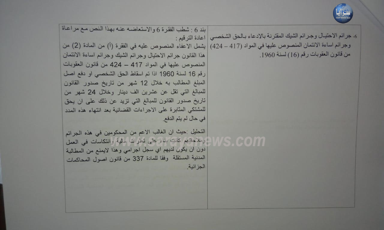 مع ايماننا المطلق بضرورة شمول كافة القضايا بالعفو العام المقرونة باسقاط الحق الشخصي، متوسماً بها كل الخير مشيداً بالدور والجهد الكبير والمميز والحس المجتمعي الذي ظهر اثناء مناقشة القانون لقد طلبت اللجنة القانونية في مجلس النواب- المكونة من النواب السادة عبد المنعم العودات ومصطفى الخصاونة ومصطفى ياغي وحسين القيسي وريم ابو دلبوح وحابس الشبيب ومفلح الخزاعلة واحمد الفريحات وزيد الشوابكة وابراهيم ابو العز ومصلح الطراونة – من النواب تقديم اقتراحاتهم حول مشروع قانون العفو العام ومع شكري تقديري لجهود اللجنة ولاحقا لجميع البيانات والمواقف التي قدمتها خلال الفترة السابقة والتي ناديت من خلالها بتوسيع قانون العفو وتضييق الاستثناءات الموجودة في مشروع القانون فقد تقدمت بالمقترحات التالية لذا ارجو من ابناء الوطن الضغط على ممثليهم النواب وعلى اعضاء اللجنة القانونية لتبني المقترحات التالية والاخذ بها حتى يكون قانون العفو ملبيا لطموحات الشعب الاردني :