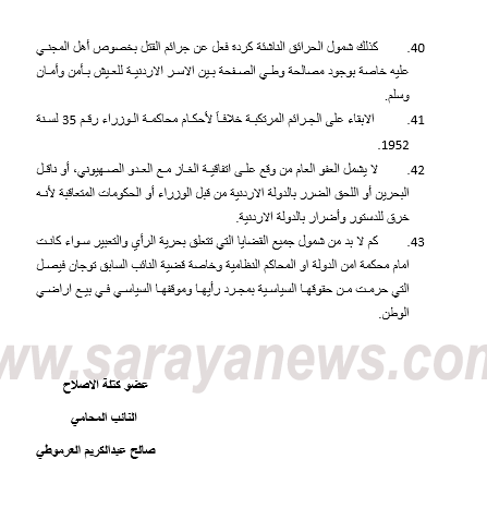 وقال العرموطي لسرايا ، ان اللجنة القانونية ستقوم بتسليم مسودة قانون العفو الى مجلس النواب خلال هذا الاسبوع ،لافتاً الى ان العفو العام يجرى عليه الان التعديلات الاخيرة .