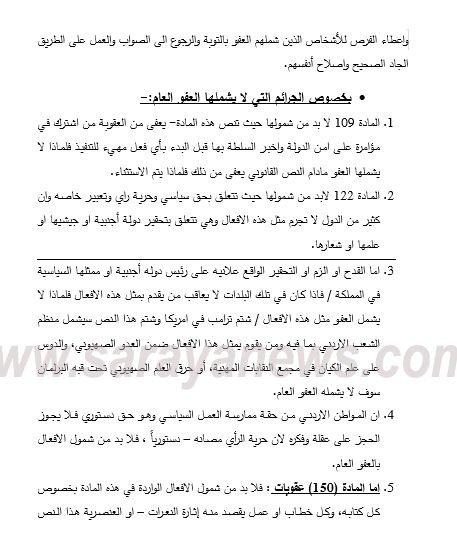 وكان رئيس الوزراء عمر الرزاز بين ان العفو العام لن يشمل جميع الجرائم كما لن يشمل جميع مخالفات السير ، مشيرا الى ان القانون شمل 70 شكلا لمخالفات السير ، مستدركاً ان هناك حوار مستمر مع مجلس النواب حول قانون العفو العام .