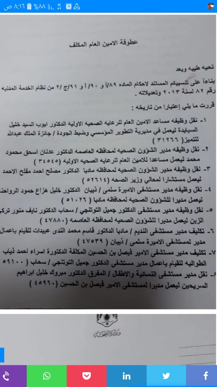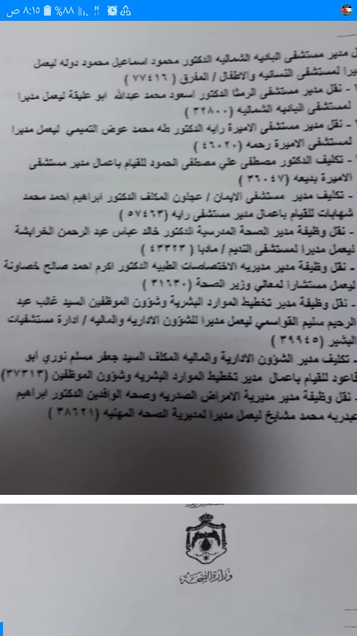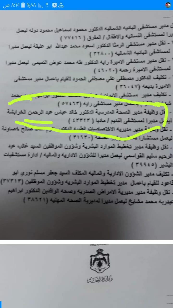 وقال الخرابشة إن استقالته أيضا جاءت بعد قرار لوزير الصحة بنقل شقيقه مديرا لصحة العاصمة، رغم وجود من هو أحق منه، و أشار لوجود الظلم في استدعاء الاستقالة.