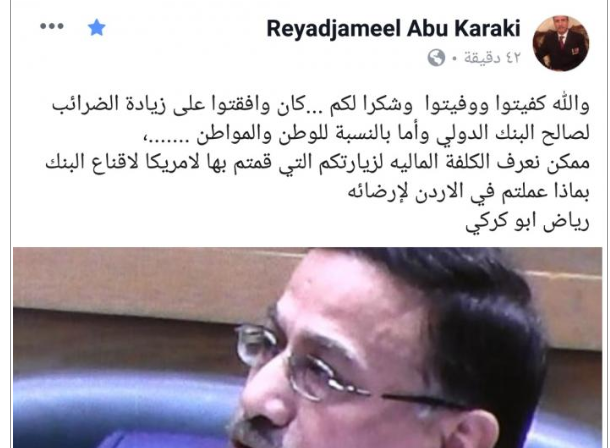 " والله كفيتوا ووفيتوا وشكرا لكم ...كان وافقتوا على زيادة الضرائب لصالح البنك الدولي وأما بالنسبة للوطن والمواطن .......، ممكن نعرف الكلفة المالية لزيارتكم التي قمتم بها لأمريكا لإقناع البنك بماذا عملتم في الأردن لإرضائه "