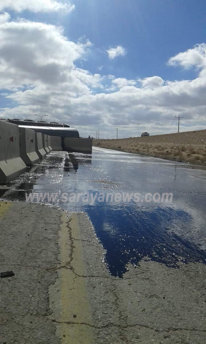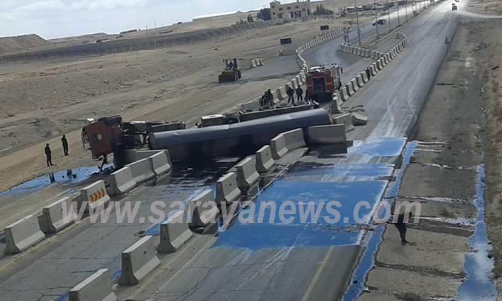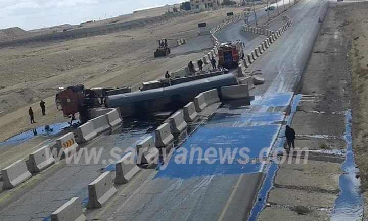سرايا - انقلب صهريج محمل بالمشتقات النفطية، اليوم الجمعة، في منطقة الحسا بمحافظة الطفيلة، جنوبي الأردن.وبدأت كوادر مديرية أشغال الطفيلة بالتعاون مع الدفاع المدني وسلطة مياه الطفيلة بالتعامل مع الحادث.