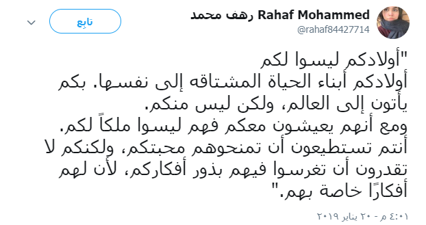 وكتبت الفتاة السعودية التي تقيم في كندا حاليا بعد هروبها من أسرتها، ما نصه: “أولادكم ليسوا لكم… أولادكم أبناء الحياة المشتاقة إلى نفسها. بكم يأتون إلى العالم، ولكن ليس منكم. ومع أنهم يعيشون معكم فهم ليسوا ملكاً لكم. أنتم تستطيعون أن تمنحوهم محبتكم، ولكنكم لا تقدرون أن تغرسوا فيهم بذور أفكاركم، لأن لهم أفكارًا خاصة بهم”.