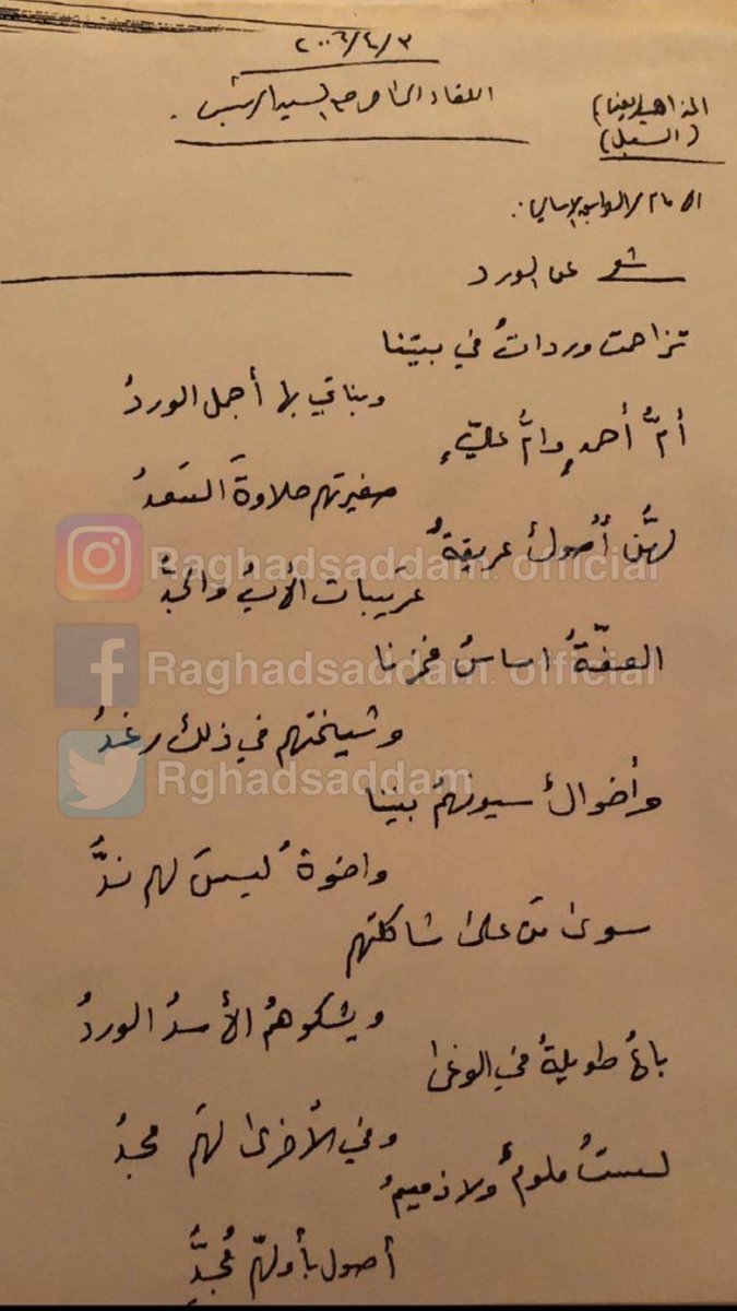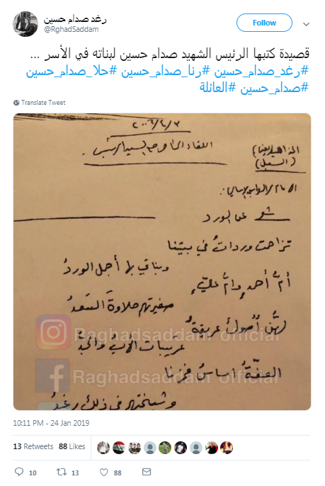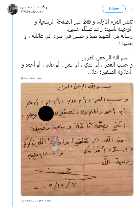 ولم تكن تلك المرة الأولى التى تكشف فيها رغد صدام حسين عن رسالة بخط يد والدها، حيث سبق ونشرت منذ يومين عبر حسابها الشخصى، رسالة من صدام حسين إلى عائلته.
