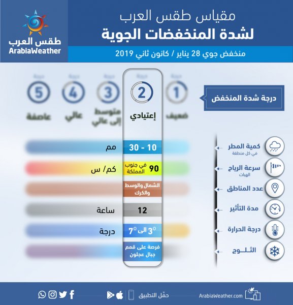 وبحسب التقارير الصادرة من غرفة العمليات الجوية في طقس العرب، فإنه من المنتظر أن تتأثر المملكة يوم الاثنين بمُنخفض جوي يُصنف بأنه من الدرجة الثانية وفقاً لمقياس شدة المنخفضات الجوية يتمركز سطحياً إلى الشرق من جزيرة قُبرص، مُترافق مع كتلة هوائية باردة في طبقات الجو كافة.