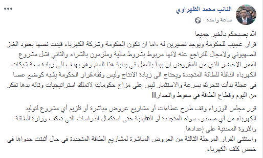 سرايا - نشر النائب محمد الظهراوي عبر حسابه الثلاثاء، على موقع التواصل الاجتماعي "فيسبوك" تعقيبا على قرار مجلس الوزراء وقف طرح عطاءات أو مشاريع عروض مباشرة أو تلزیم أي مشروع لتولید الكهرباء من أي مصدر، سواء المتجددة أو التقلیدیة حتى استكمال الدراسات التي تعكف وزارة الطاقة والثروة المعدنیة على إعدادها.