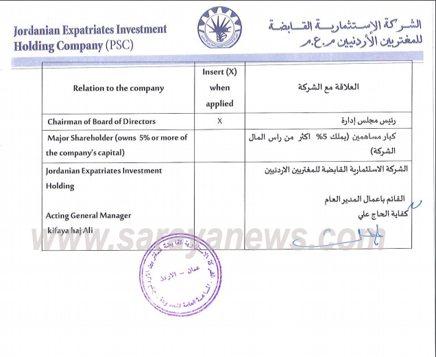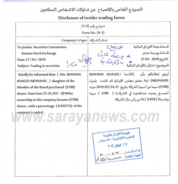 سرايا - اظهرت وثيقة حصلت عليها سرايا ان ابنة عضو مجلس الادارة قامت بشراء (5700) سهما من اسهم الشركة الاستثمارية القابضة للمغتربين ، بتاريخ 22-24-1-2019 .