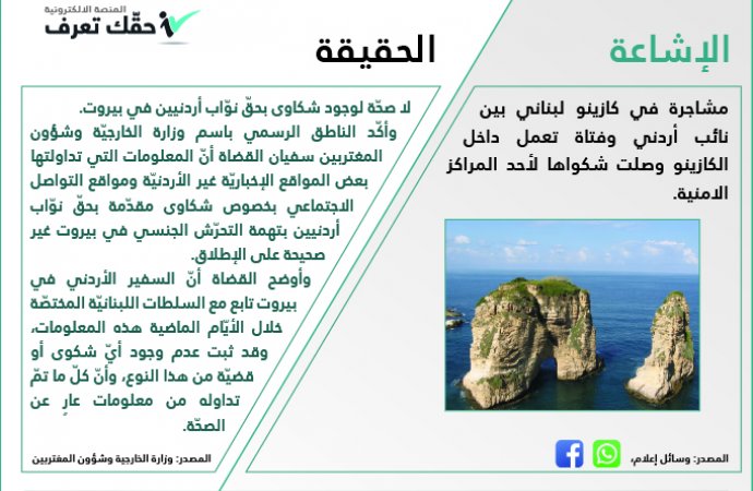 وأكد الناطق الاعلامي باسم الوزارة سفيان القضاة عبر منصة "حقك تعرف"، أن المعلومات التي تداولتها بعض المواقع الإخبارية غير الأردنية ومواقع التواصل الاجتماعي بخصوص شكاوى مقدمة بحق نواب أردنيين بتهمة التحرش الجنسي في بيروت غير صحيحة على الإطلاق.