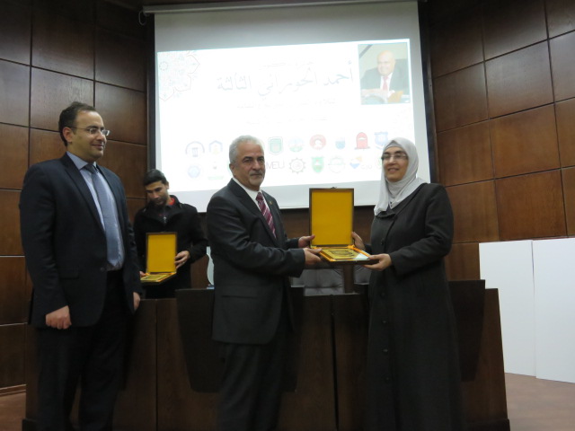 وفي نهاية المسابقة قام رئيس جامعة عمان الأهلية الأستاذ الدكتور ساري حمدان والى جانبه الدكتور مصطفى العطيات عميد شؤون الطلبة بتكريم أعضاء لجان التحكيم ، وتسليم الجوائز للفائزين بالمراكز الثلاثة الأولى.